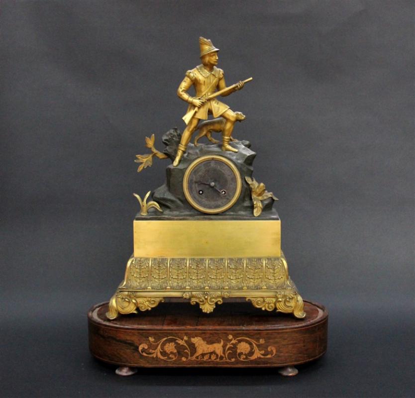 Pendule romantique au chasseur et son chien en bronze à deux patines, mouvement de Pons, avec globe et socle de bois marqueté.