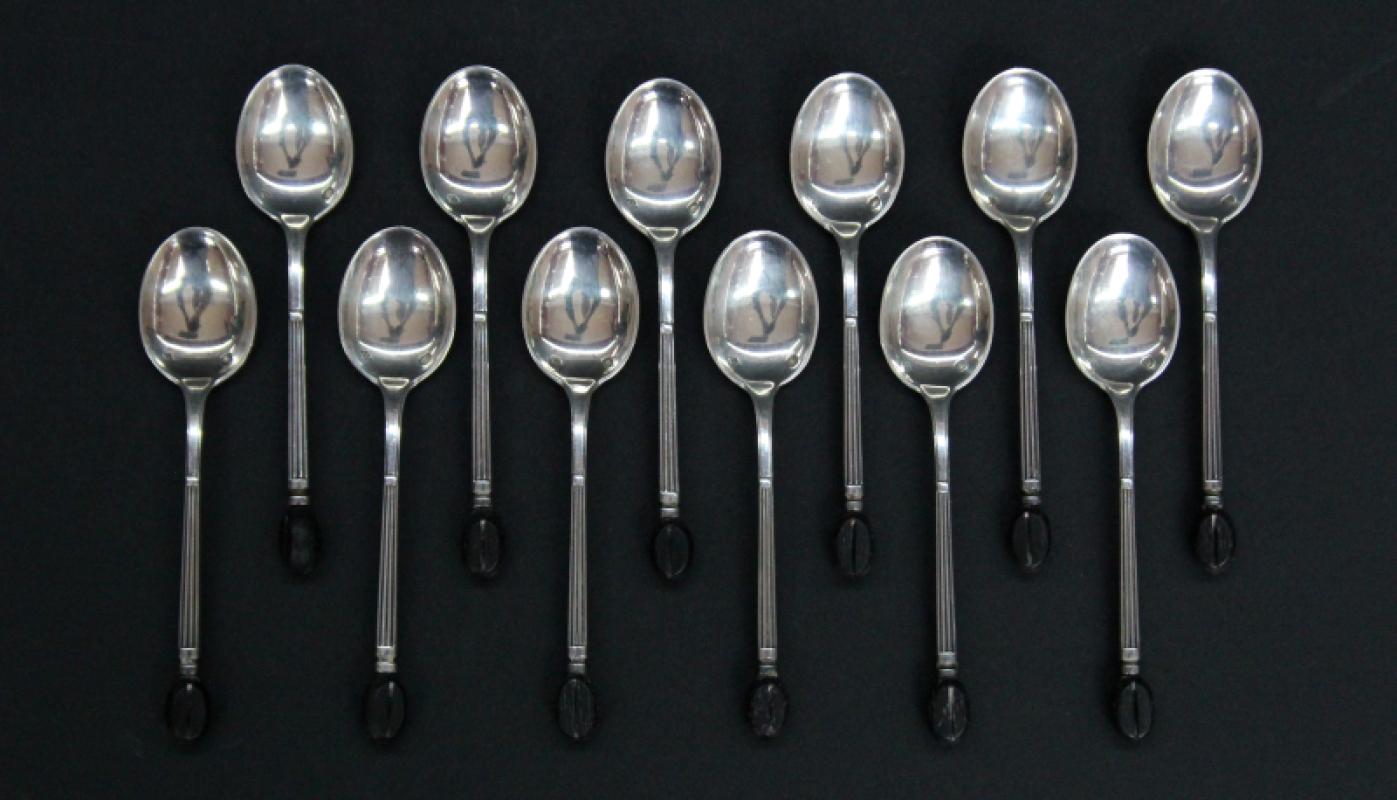 Douze cuillères à moka en argent, manches à cannelures terminés par un grain de café en bois - Poinçon de Maître, poinçon Minerve,