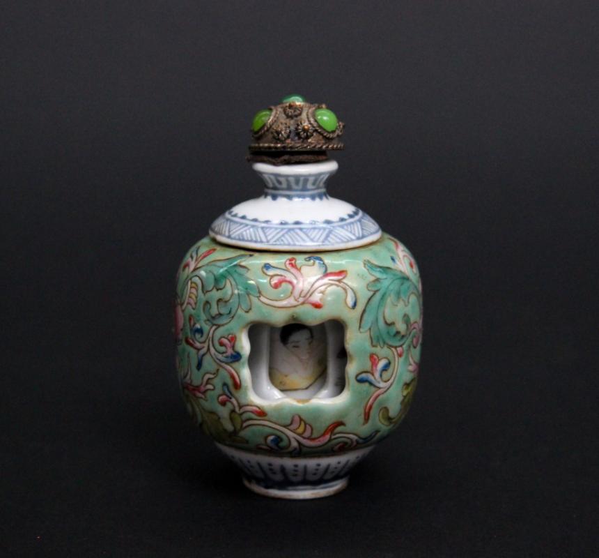 Tabatière en porcelaine à décor polychrome de fleurs et rinceaux. La panse ajourée laisse voir un décor tournant de scènes érotiques