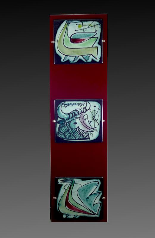 Suite de 3 carreaux de faïence vernissée de format carré à décors zoomorphes, montés dans un encadrement en bois laqué rouge. Signés dans la pâte au dos.