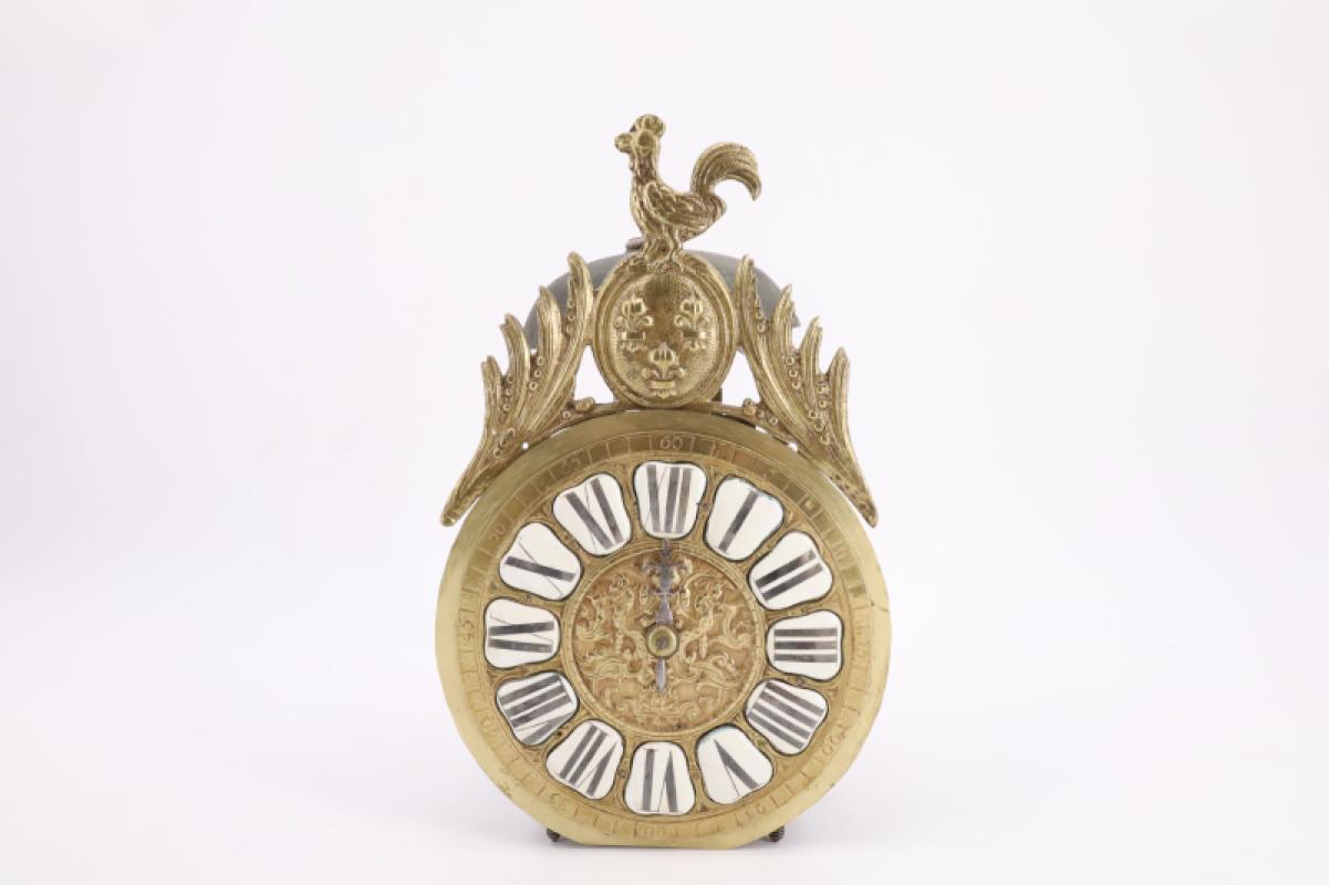 Pendule dite à la capucine en laiton, surmontée d'un timbre, le cadran en laiton à index émaillés blanc à chiffres romains, fronton aux armes de France surmontées d'un coq.