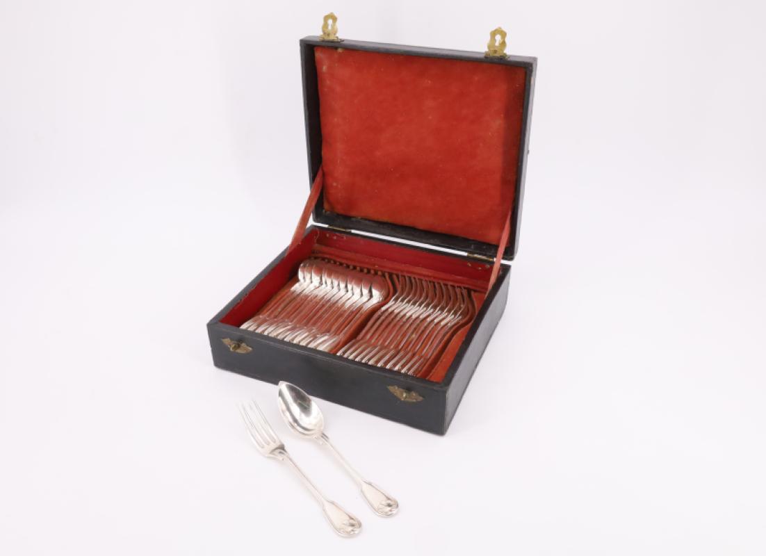 Suite de douze couverts à dessert modèle coquille en métal argenté dans un écrin garni de chamoisine rouge, gravés des initiales F.L en gothique.