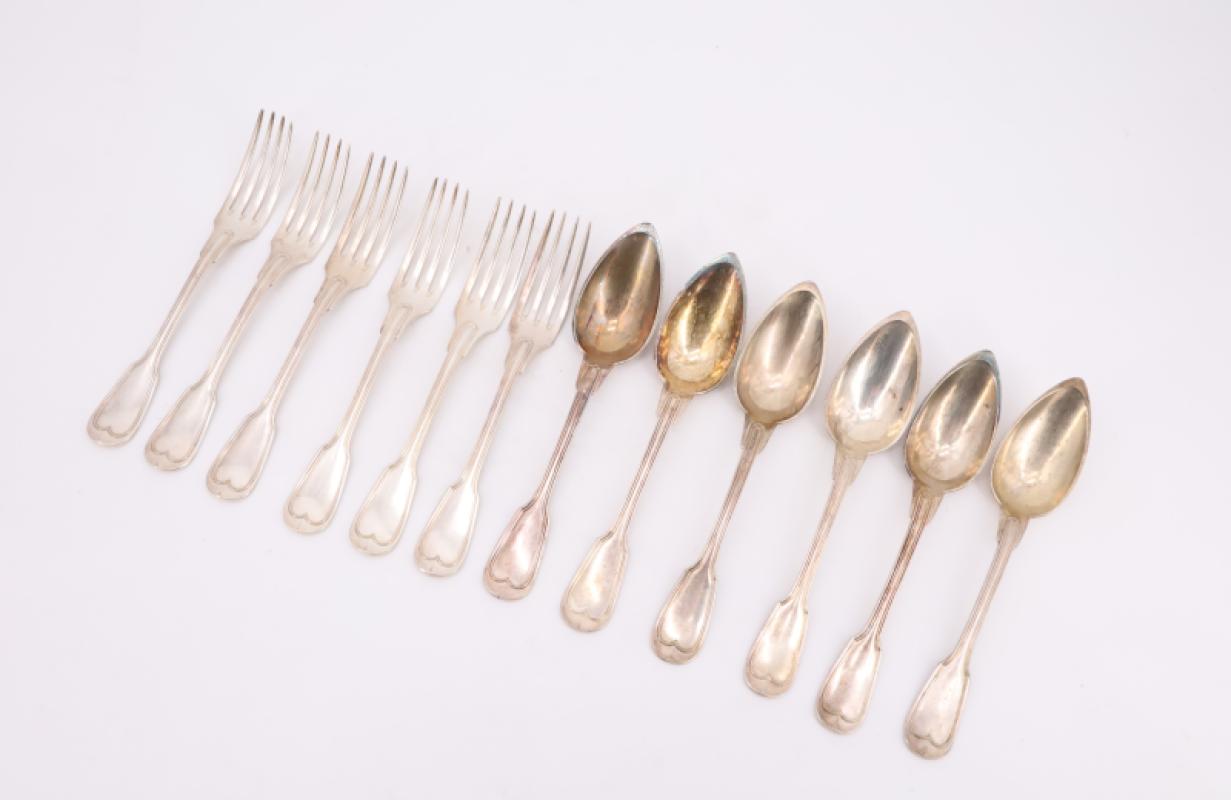 Suite de six couverts de table modèle filet en alfénide argenté, gravés des initiales L.D.