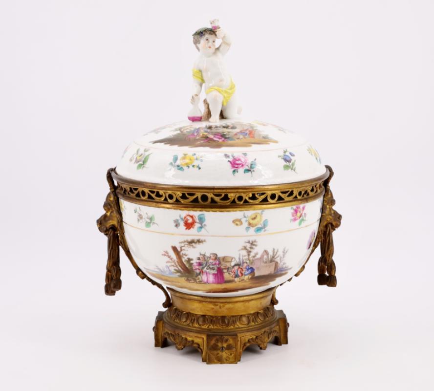 Important pot-pourri de style Louis XVI, le corps et le couvercle en porcelaine à décor polychrome de scènes buccoliques, la prise formée d'un Bacchus enfant tenant une coupe et un flacon (restauration et infimes égrenures). Riche monture de bronze doré, les prises à mufle de lion.