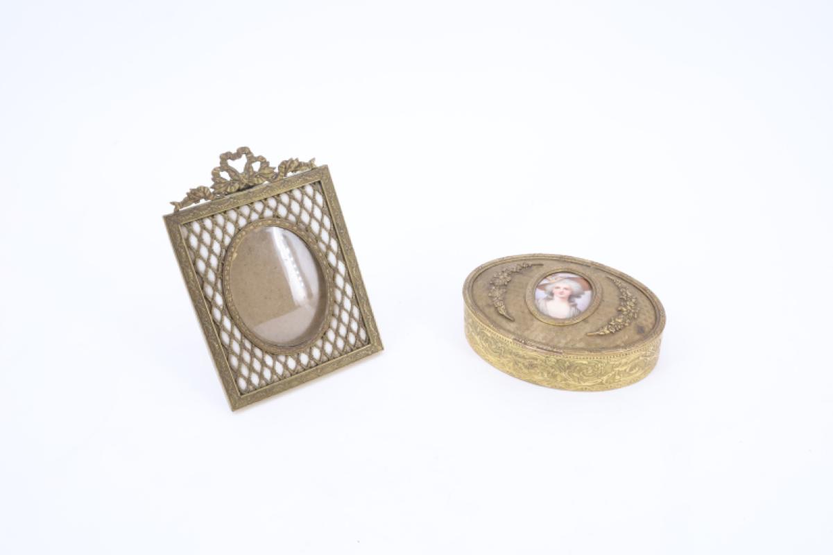 Lot composé d'une boîte en laiton de forme ovale de style Louis XVI ornée sur le couvercle d'une miniature ovale sur porcelaine représentnant Marie Antoinette, et un cadre à photo de style Louis XVI à vue ovale en laiton.