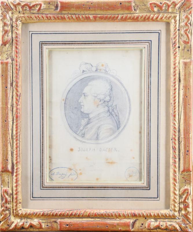 Notre dessin est probablement l'esquisse préparatoire du revers de la médaille gravée par Dupré à l'effigie de Bon-Joseph Dacier, portant la mention : "JOSEPH DACIER SECR. PERP. DE L'ACADEMIE DES INSCRIP. ET B.L." conservée au musée d'Art et d'Industrie de Saint-Etienne. Historien, philologue, Bon Joseph Dacier avait refusé le ministère des finances sous Louis XVI. Il fut nommé secrétaire perpétuel de l'Académie des Inscriptions et Belles Lettres en 1782.