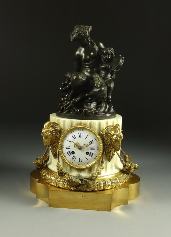Pendule de cheminée de style Louis XVI en marbre blanc et bronze à deux patines, le corps formé d'un tambour de colonne cannelée reposant sur une torre de frise de lauriers soustenue par une base en plinthe carrée à écoinçons. Le corps de la colonne flanqué de têtes de boucs reliées par des guirlandes de roses, et surmonté d'un groupe en bronze à patine brun fonçé représentant une faunesse et ses petits jouant du tambourin et de la syrinx. Cadran circulaire en émail à chiffres romains en bleu pour les heures, chemin de fer et chiffres arabes en noir pour les minutes. Aiguilles en laiton ajouré de rinceaux feuillagés, lunette à rang de perles en bronze doré. Mouvement à suspension à fil signé "Ls Moinet A Paris" sur la platine portant également le cachet "Japy Frères médaille d'or".