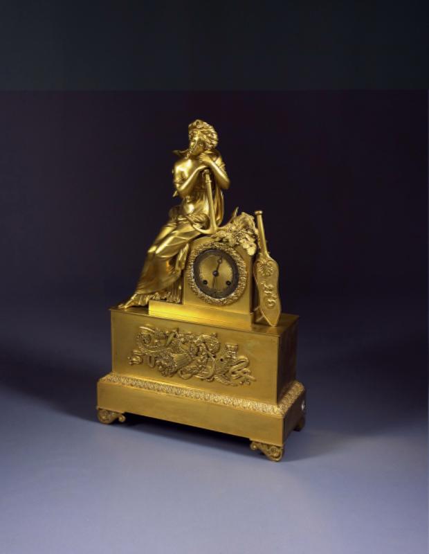Pendule romantique en bronze doré à l'allégorie de la marine représentée par une jeune femme appuyée sur une ancre reposant sur le cadran, reposant sur une base rectangulaire à décor en relief d'ancre, figure de proue, trident et corne d'abondance. Cadran circulaire à fond guilloché, aiguilles à oeil de perdrix de type Breguet.