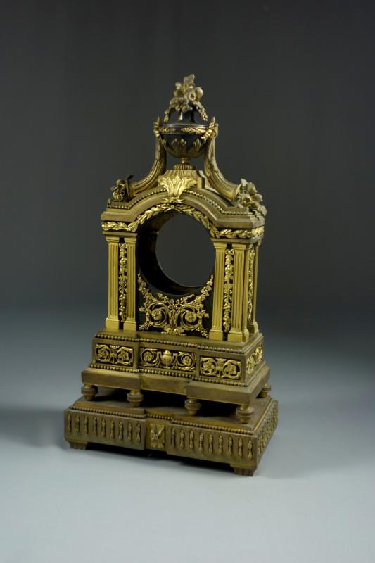 Caisse de pendule en bronze doré de style louis XVI, à décors de pilastres, cornes d'abondance et rinceaux feuillagés, reposant sur une base rectangulaire.