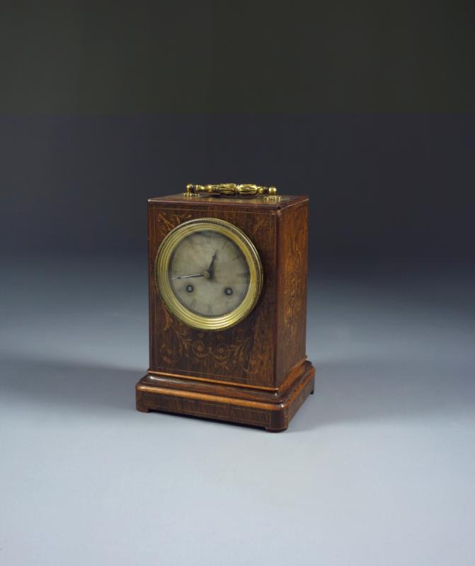 Pendulette de voyage de forme rectangulaire en marqueterie et bois de placage.