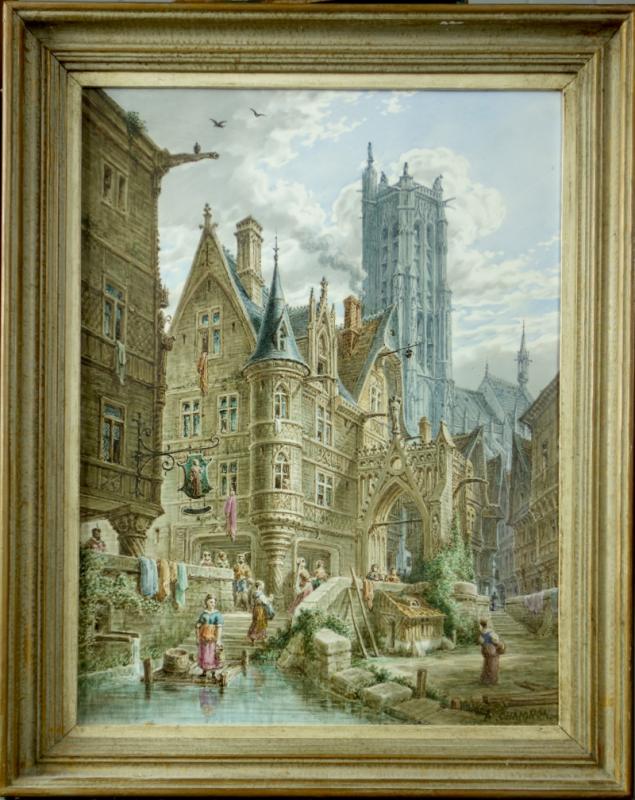 Vue d'une ville imaginaire au Moyen-Age animée de personnages avec une cathédrale à l'arrière-plan.