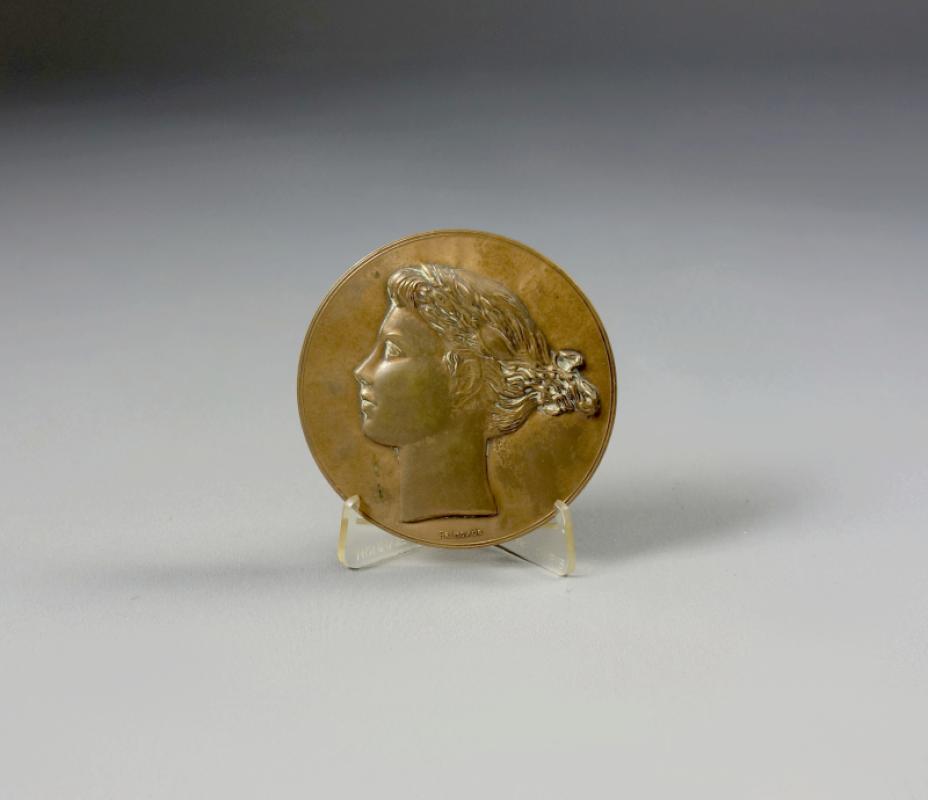 Médaille en bronze présentant un profil de jeune femme signé Belmondo en dessous. Sur l'avers, Diane tenant un arc avec ses chiens.