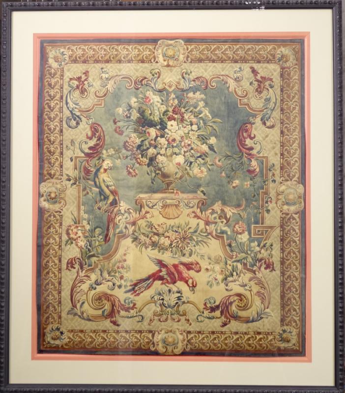 Projet de tapisserie ou de décor au bouquet de fleurs et perroquets dans des rinceaux feuillagés.