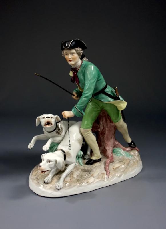 Important sujet en porcelaine polychrome représentant un valet de chiens.