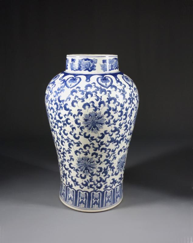 Important vase en porcelaine de forme balustre à décor bleu et blanc de fleurs stylisées et rinceaux feuillagés.