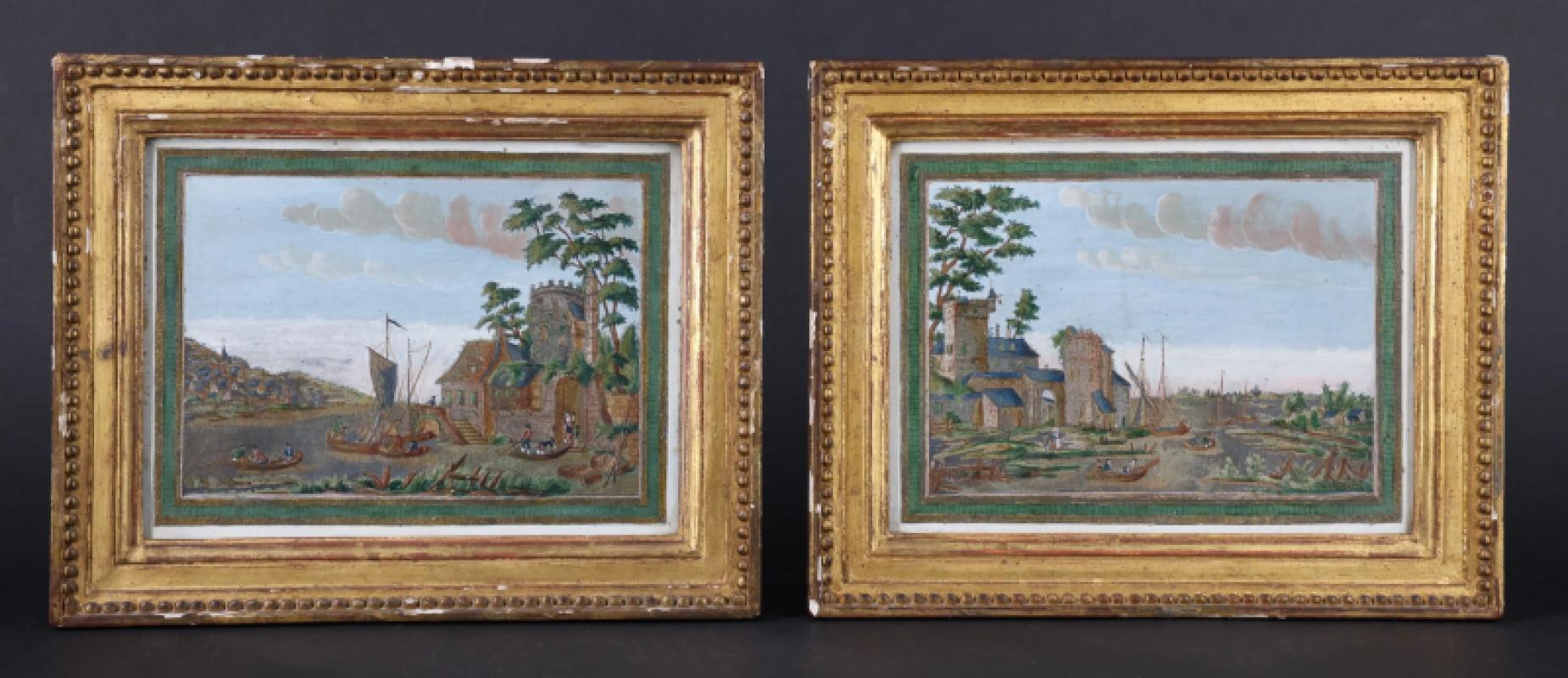 Paire de petits tableaux rectangulaires polychromes et or sur feuille d’étain estampé représentant des vues de ports animés dans le goût flamand. Cadres de l’époque en bois sculpté et doré à rang de perles.