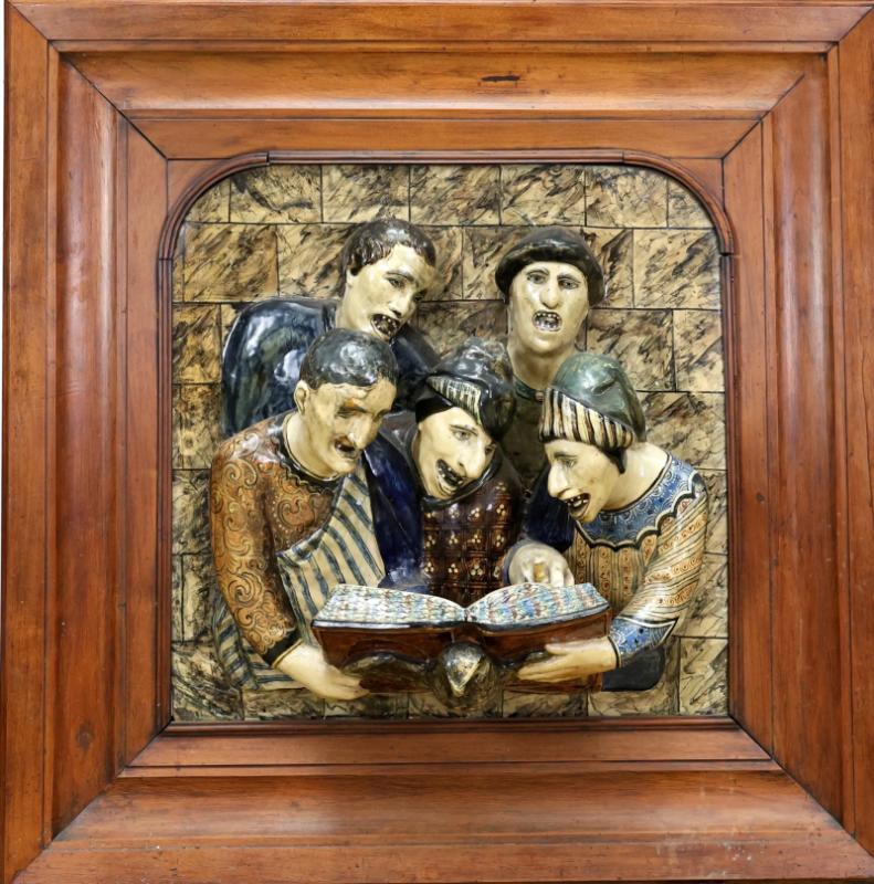 Important sujet en faïence polychrome encadré.