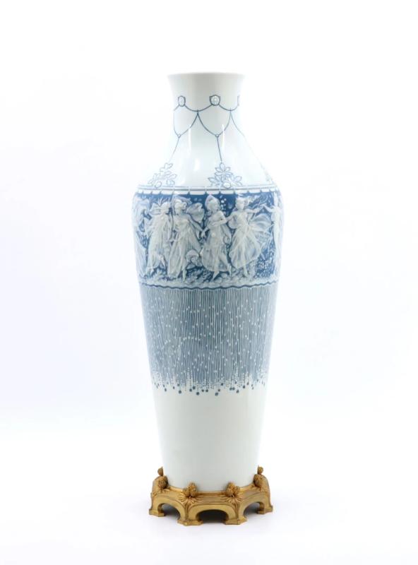 Grand vase balustre, 1904, à décor pâte sur pâte d’une frise de nymphes sur fond bleu.