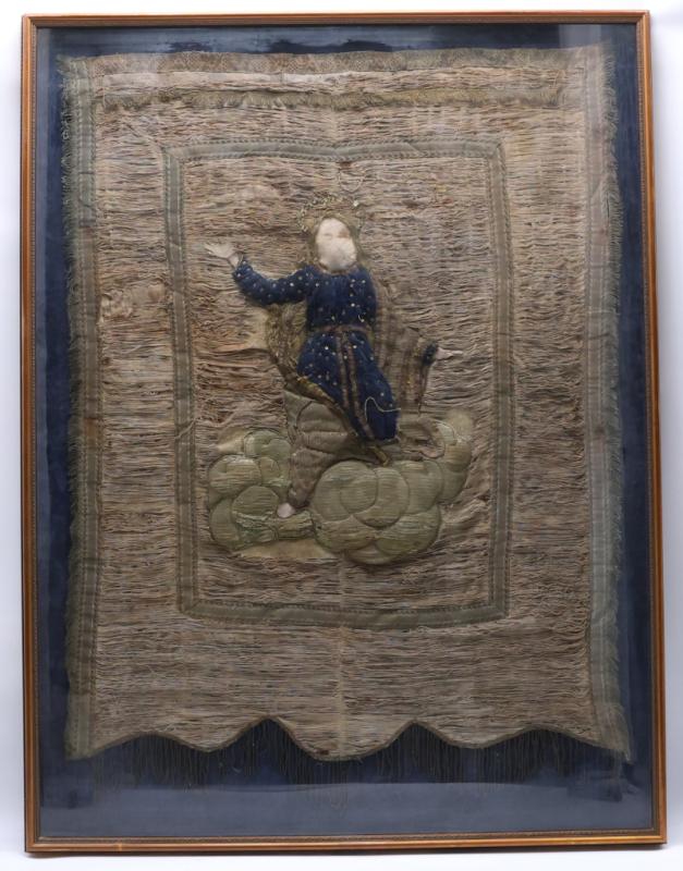 Bannière de procession en fils tissés argentés et dorés orné d'un Saint personnage auréolé dans une nuée - XVIIe-XVIIIe siècle - Sous cadre - Dim. cadre: 133 cm x 101 cm (accidents et manques)