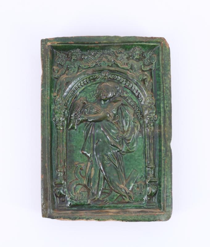 Carreau de poêle en grès émaillé vert à décor d'une allégorie de l'espérance dans un encadrement architecturé richement orné, inscrit "Hofnung" en relief dans le fond - Fêle latéral - Allemagne ou Est de la France, XVIIème siècle - H. 25 cm, L. 17 cm, P. 2 cm
