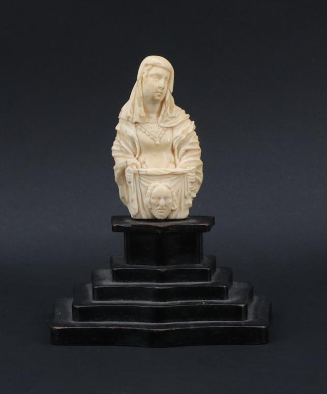 Sujet en ivoire de morse (Odobenus rosmarus divergens) sculpté représentant Sainte Véronique, reposant sur un socle à gradins en bois noirci.