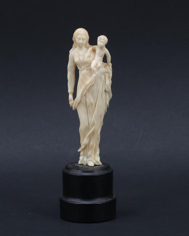 Vierge à l’Enfant en ivoire de morse (Odobenus rosmarus divergens) sculpté reposant sur une base en ébène (Diospyros nigra) tourné France, vers 1900 Hauteur totale : 15 cm