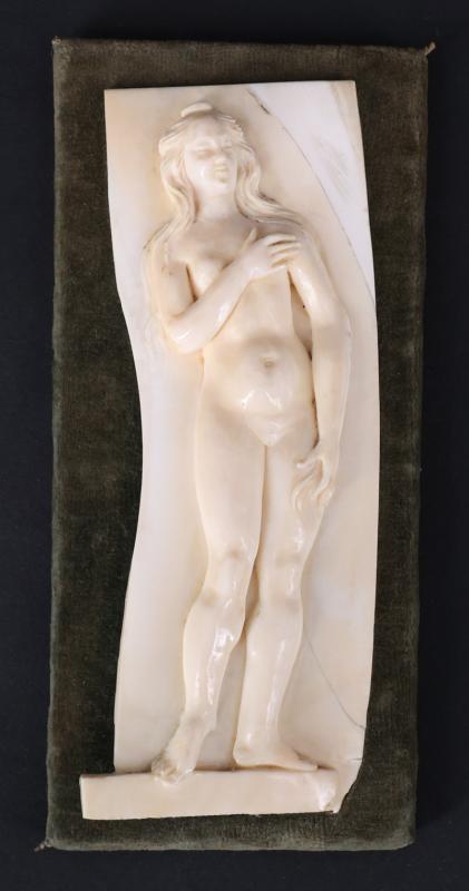 Plaquette en ivoire d'hippopotame (Hippopotamus amphibius) sculptée en relief d’une Marie-Madeleine debout fixée sur unsupport postérieur garni de velours vert.