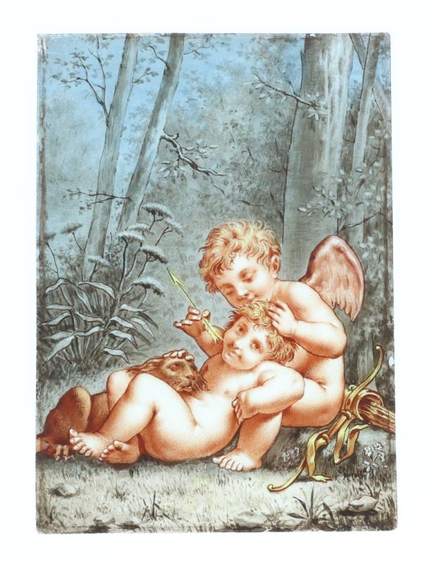 Plaque en verre truslicide à décors peint de deux Amours dans un paysage, daté 1887 en bas à droite - XIXe siècle - 22 cm x 16 cm (petites usures en bordure)