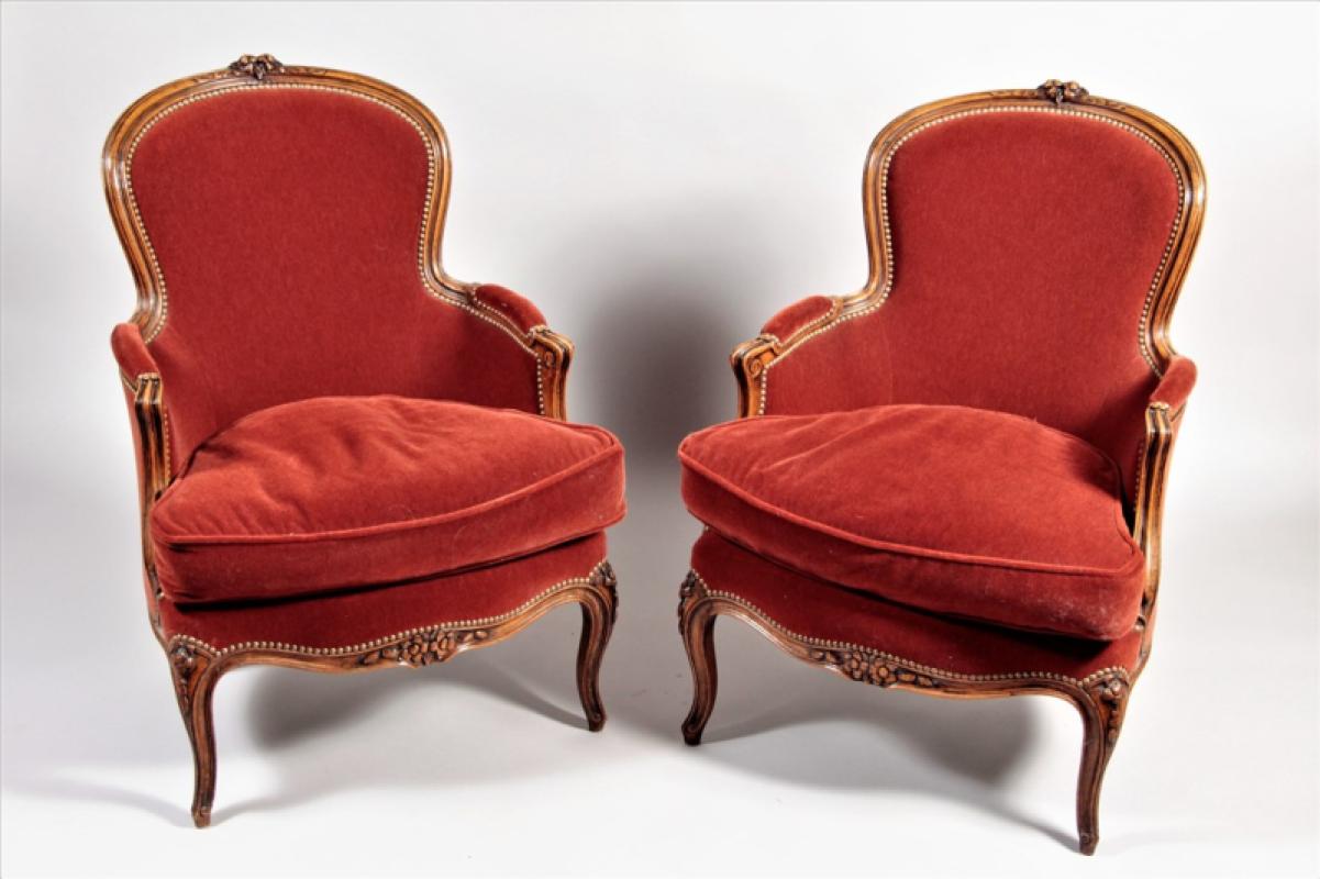 Paire de bergères de style Louis XV en hêtre mouluré et sculpté.