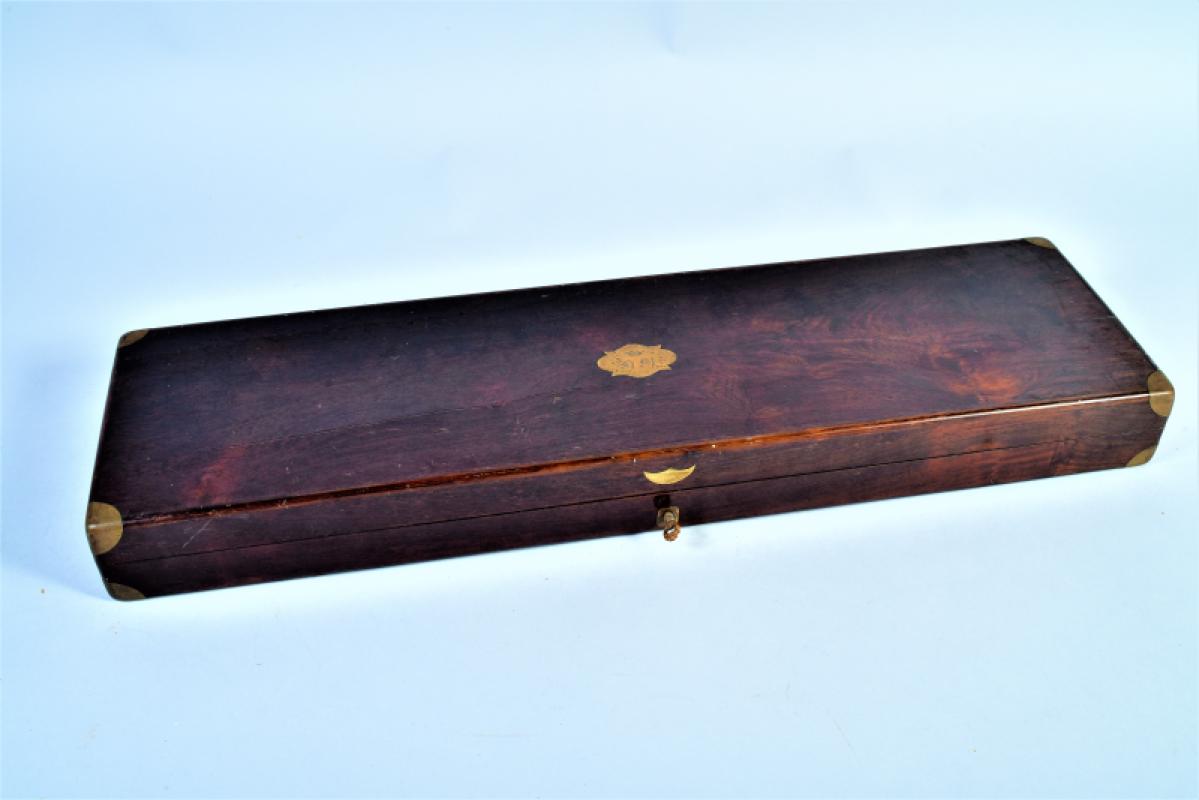 Coffret à fusil Lefaucheux en placage de palissandre sur âme de chêne, garni de velours rouge, orné d'une plaque de laiton gravée du chiffre H.M surmonté d'une couronne de baron. Entrée de serrure, onglet de tirage et renforts de coins également en laiton.