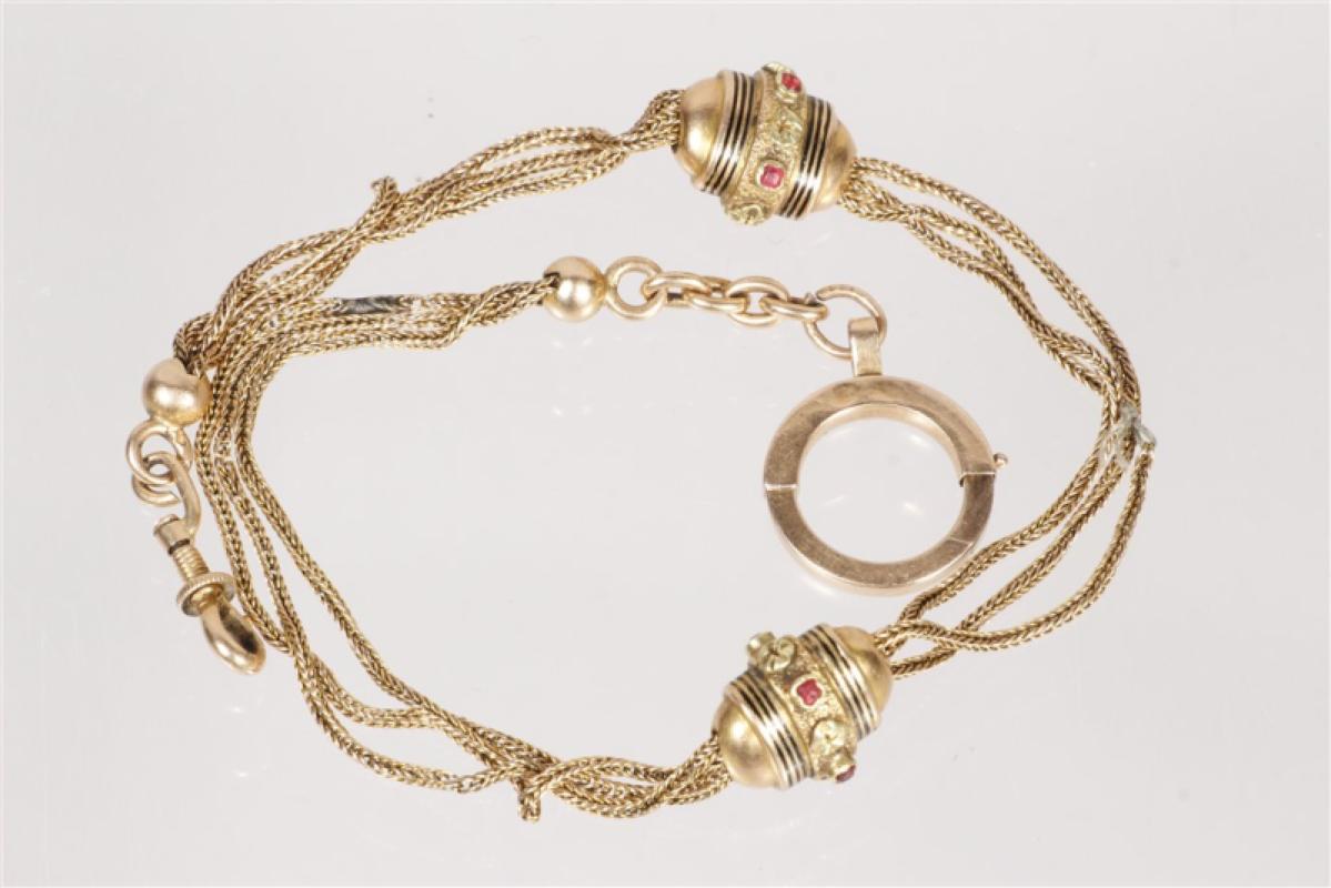 Chaîne de montre en or jaune 750/°°, à deux olives coulissantes serties de pierres d'imitation rouges.