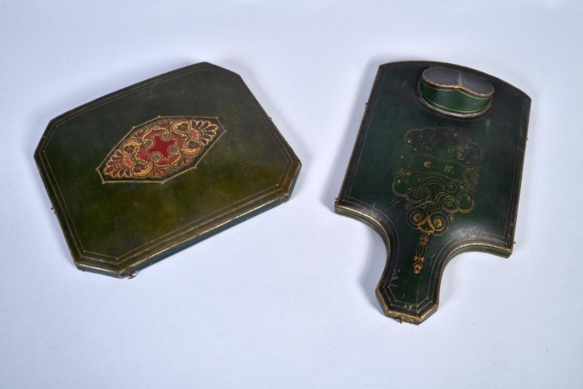 Lot de deux importants écrins à parure en cuir vert doré au petit fer, garni de velours beige.