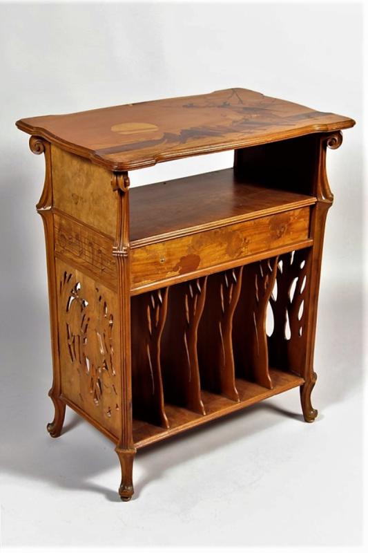 Meuble à musique en noyer, placage de noyer et marqueterie, le plateau, à découpe mouvementée, marqueté d'un décor d'oiseaux saluant le lever du soleil, les côtés plaqués de loupe sur le registre supérieur. le registre médian est marqueté d'un décor de portée musicale en clef de sol notée sur le côté gauche, il ouvre par un tiroir à boutons de tirage en bronze représentant un papillon en façade, et est marqueté d'un décor de cigales sur le côté droit. Le registre inférieur, dont les côtés ajourés sont à décor de clochettes à gauche et de troncs d'une forêt à droite, présente quatre compartiments verticaux pour les partitions, séparés par des cloisons, elles aussi ajourées en forêt. Les montants moulurés et disposés à pans coupés, terminés part des enroulements à l'imitation d'une volute de violon.