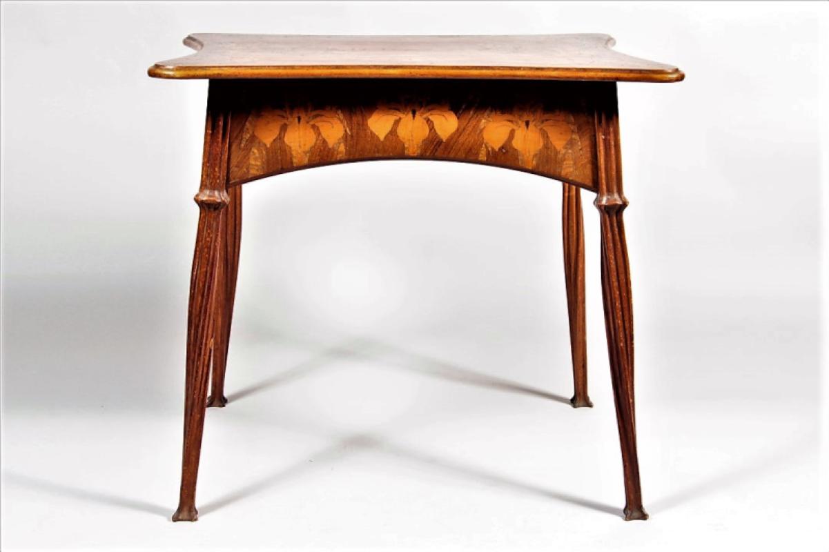 Camille Gauthier était créateur de marqueteries pour Louis Majorelle. En juillet 1900, il quitte la maison Majorelle et s'installe à son propre compte. Comptant parmi les chefs de file de l'Ecole de Nancy, il présente une série de meubles lors de l'exposition de l'Ecole de Nancy au pavillon de Marsan en 1903. Une table similaire à la nôtre figure dans le catalogue des petits meubles présentés lors de cette exposition. Il existe deux versions de notre table (une signée Majorelle et l'autre non signée), ce qui accréditerait l'idée que Gauthier était le vrai créateur du modèle pour Majorelle et qu'il a continué à le produire après son départ.