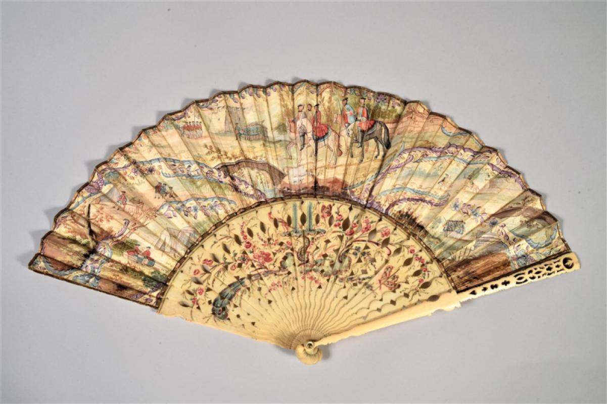 Eventail de type plié en ivoire, à 25 brins, les panaches ajourés et chantournés. La feuille en parchemin peint à la gouache d'une scène de manoeuvres militaires; Les bordures sont renforcées d'une bandelette de bordage dorée. Les brins, à découpe alternée en serpentin crenelé et droite, sont peints d'une fontaine, d'oiseau et de papillons dans des bouquets de fleurs.