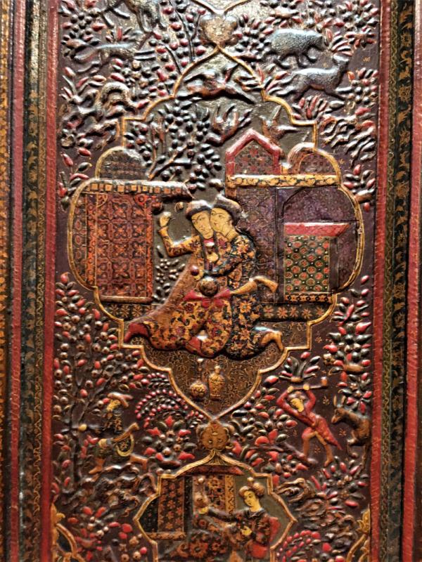 Paire de ventaux en bois laqué en relief dans le style Safavide, à riche décors de personnages et d'animaux dans des réserves. Inscriptions en Farsi.