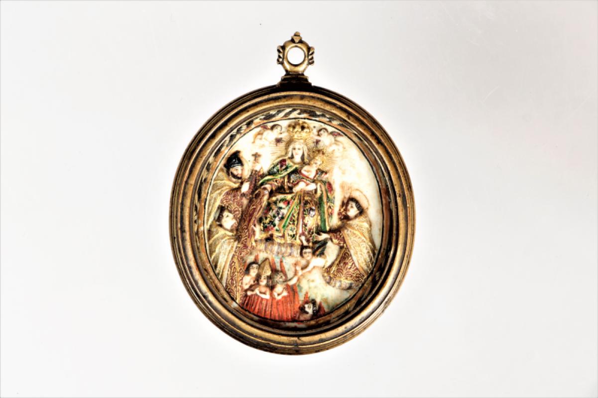 Médaillon en ivoire sculpté en bas-relief, rehaussé de polychromie et dorure représentant sur une face une Vierge triomphante couronnée par deux anges tenant l'Enfant sur son bras gauche, imposant la chasuble à st Ildefonse de Tolède. Sur l'autre face, le Christ portant un enfant, surmontant un globe céleste agrémenté d'un phylactère porté par deux têtes d'anges, portant la mention "REFUGIUM AGONIZANTUM" (sic).
