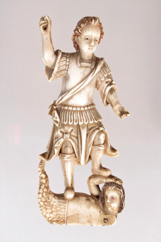 Saint Michel terrassant le démon en ivoire sculpté en ronde bosse, anciennement polychromé et doré. Il est représenté debout, ceint d’une écharpe en bandoulière et levant sa lance.
