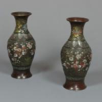 Paire de vases de forme balustre à col évasé en bronze champlevé et émaux polycromes à décors de fleurs sur fond de grecques.