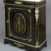 Meuble d'entre-deux en placage de bois noirci et incrustations de filets de laiton dans le style Boulle, à montants à pans coupés, ouvrant par un tiroir et une porte ornée d'un médaillon en ressaut. Ornementation de Bronze doré, dessus de marbre blanc.