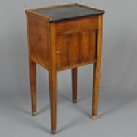 Table de chevet en noyer naturel ouvrant par un tiroir et un rideau en façade, reposant sur quatre pieds gaines.