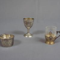 Lot composé d'un passe-thé, un coquetier et un petit verre à monture en argent (accident et restaurtations).