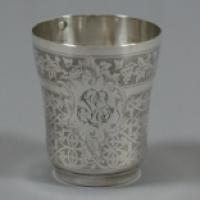 Timbale en argent 1er titre, légèrement évasée, gravée de rinceaux et d'initiales (L.G.), sur fond guilloché.