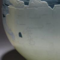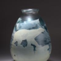 Important vase dit aux " Ours polaire ". Épreuve de tirage industriel réalisée en verre doublé blanc sur fond bleu ciel nuancé blanc. Décor d'ours polaire sur la banquise, gravé en camée à l'acide, haut du vase légèrement repris la meule à larges facettes (infime éclat tête d'épingle en surface).