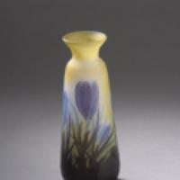 Vase légèrement piriforme à col étranglé et évasé. Épreuve de tirage industriel réalisée en verre doublé bleu sur fond jaune nuancé blanc. Décor de Crocus, gravé en camée à l'acide.