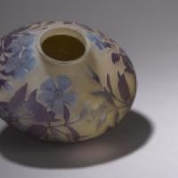 Vase à corps aplati. Épreuve de tirage industriel réalisée en verre doublé bleu sur fond blanc nuancé légèrement jaune. Décor de Primulacées, gravé en camée à l'acide.