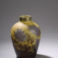 Pied de lampe de forme ovoïde. Épreuve de tirage industriel réalisée en verre doublé bleu ciel sur fond jaune. Décor de chrysanthèmes Chinois, gravé en camée à l'acide. Monture à vis en métal.