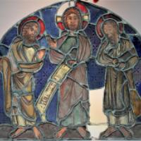 Vitrail représentant le Christ entouré de deux saints personnages et tenant dans sa main un philactère portant le mot Medixcritis.
