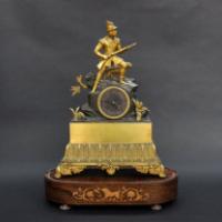 Pendule romantique au chasseur et son chien en bronze à deux patines, mouvement de Pons, avec globe et socle de bois marqueté.