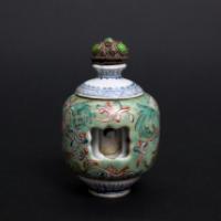 Tabatière en porcelaine à décor polychrome de fleurs et rinceaux. La panse ajourée laisse voir un décor tournant de scènes érotiques